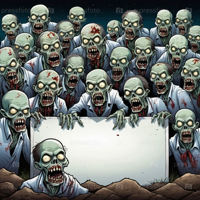 Большая группа зомби, их лица искажены в выражениях голода и упадка, держат пустой знак, их бледная, разлагающаяся кожа и пятна крови видны. Мертвые поднимаются на кладбище ночью. ИИ