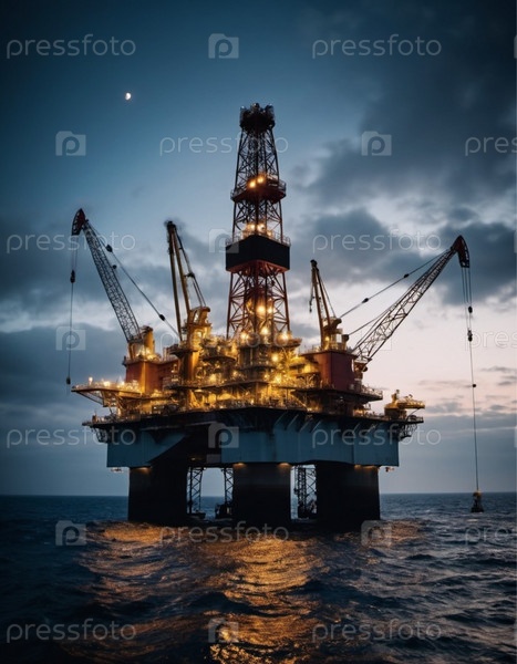 Большая, освещенная морская нефтяная вышка стоит высоко в воде в сумерках. Огни буровой установки бросают теплое свечение на темнеющее небо, а силуэт платформы обрамлен рябью воды. ИИ