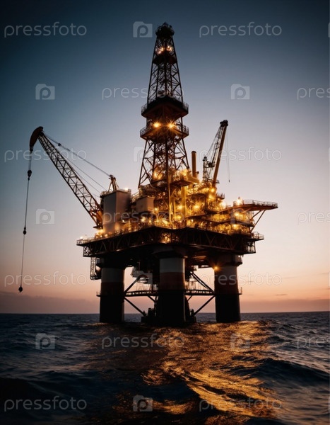 Большая, освещенная морская нефтяная вышка стоит высоко в воде в сумерках. Огни буровой установки бросают теплое свечение на темнеющее небо, а силуэт платформы обрамлен рябью воды. ИИ