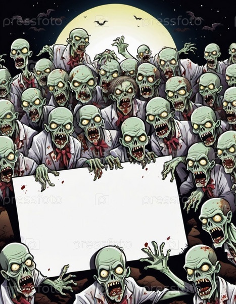 Большая группа зомби, их лица искажены в выражениях голода и упадка, держат пустой знак, их бледная, разлагающаяся кожа и пятна крови видны. Мертвые поднимаются на кладбище ночью. ИИ