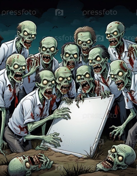 Большая группа зомби, их лица искажены в выражениях голода и упадка, держат пустой знак, их бледная, разлагающаяся кожа и пятна крови видны. Мертвые поднимаются на кладбище ночью. ИИ
