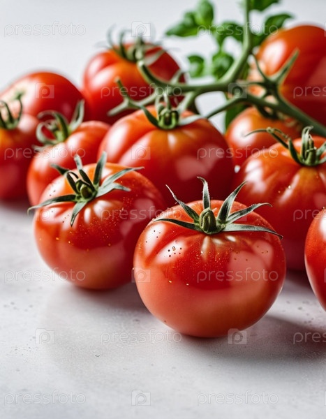 Группа спелых, красных помидоров. Помидоры расположены в кластере. Свет захватывает поверхность томатов, выделяя их яркий цвет и блестящую текстуру. Их недавно собрали. Сгенерированный ИИ