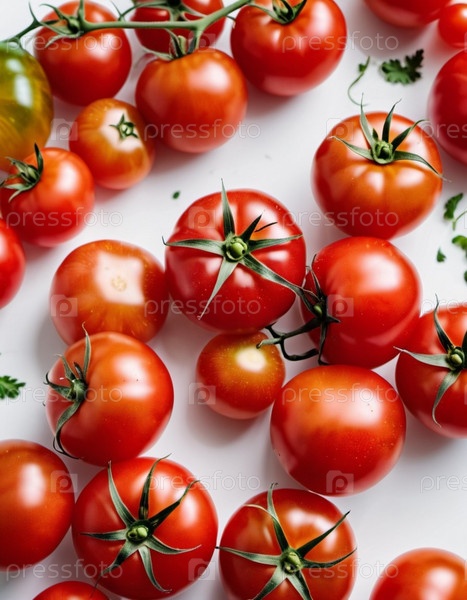 Группа спелых, красных помидоров. Помидоры расположены в кластере. Свет захватывает поверхность томатов, выделяя их яркий цвет и блестящую текстуру. Их недавно собрали. Сгенерированный ИИ
