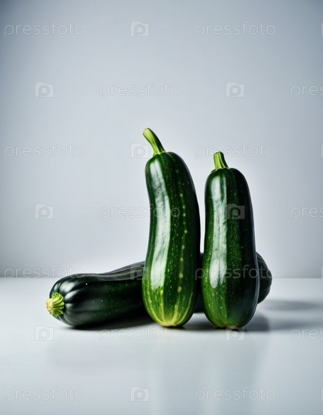 Овощи цуккини, яркий зеленый оттенок, расположенные на нетронутой белой поверхности. Цуккини расположены в различных ориентациях, демонстрируя их вытянутые, цилиндрические формы, гладкие, твердые текстуры. ИИ