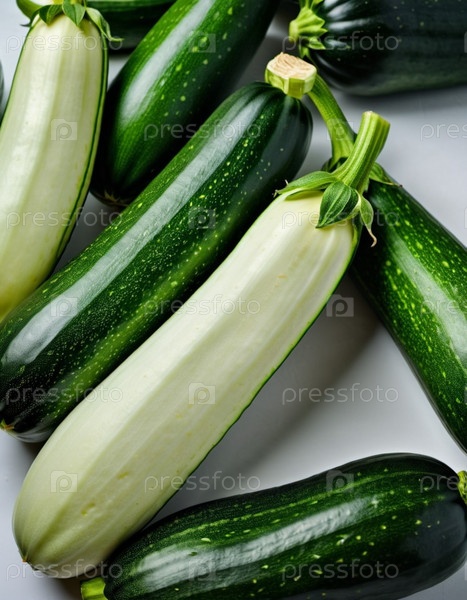 Овощи цуккини, яркий зеленый оттенок, расположенные на нетронутой белой поверхности. Цуккини расположены в различных ориентациях, демонстрируя их вытянутые, цилиндрические формы, гладкие, твердые текстуры. ИИ