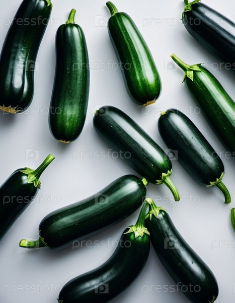Овощи цуккини, яркий зеленый оттенок, расположенные на нетронутой белой поверхности. Цуккини расположены в различных ориентациях, демонстрируя их вытянутые, цилиндрические формы, гладкие, твердые текстуры. ИИ
