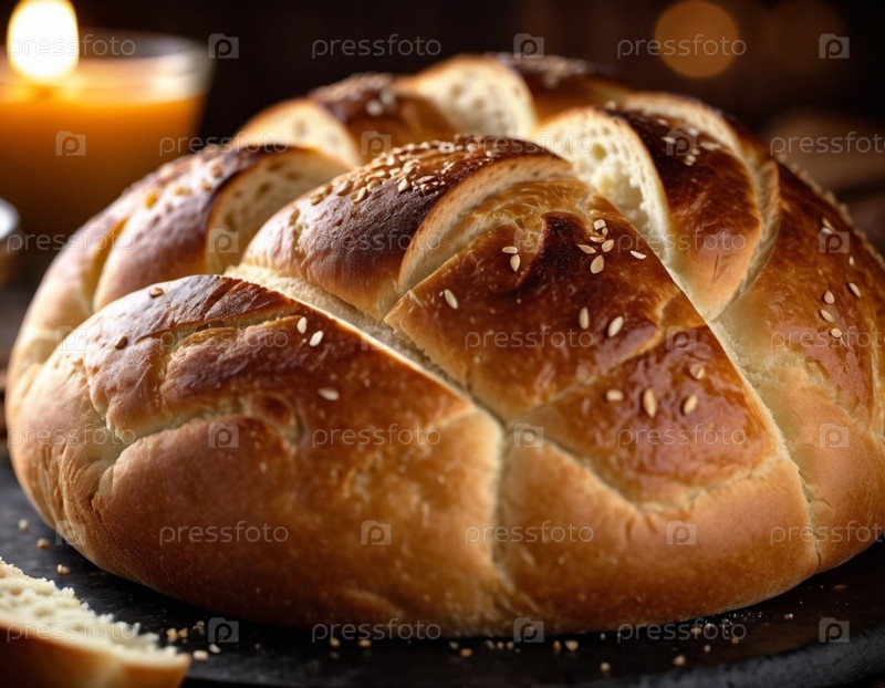 Красиво обработанная круглая буханка хлеба выходит из духовки, ее золотая корка сверкает семенами кунжута. Теплый приглашающий хлеб сидит на деревянной доске, излучая утешительный аромат, который наполняет деревенскую кухню