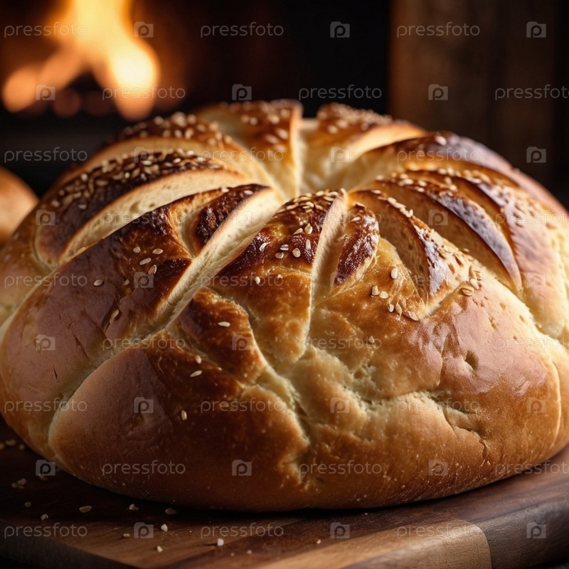 Красиво обработанная круглая буханка хлеба выходит из духовки, ее золотая корка сверкает семенами кунжута. Теплый приглашающий хлеб сидит на деревянной доске, излучая утешительный аромат, который наполняет деревенскую кухню
