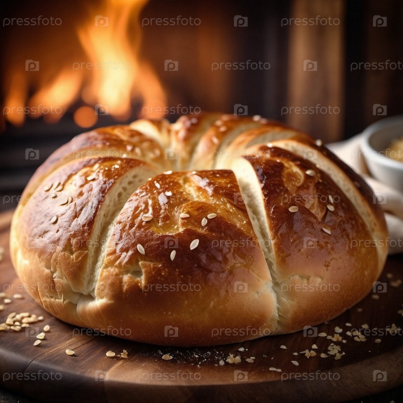 Красиво обработанная круглая буханка хлеба выходит из духовки, ее золотая корка сверкает семенами кунжута. Теплый приглашающий хлеб сидит на деревянной доске, излучая утешительный аромат, который наполняет деревенскую кухню