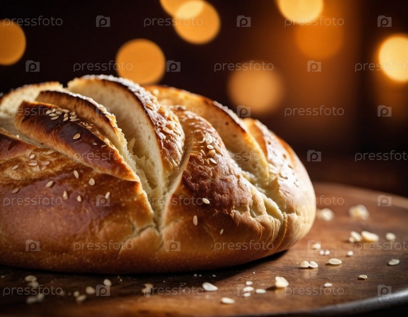 Красиво обработанная круглая буханка хлеба выходит из духовки, ее золотая корка сверкает семенами кунжута. Теплый приглашающий хлеб сидит на деревянной доске, излучая утешительный аромат, который наполняет деревенскую кухню
