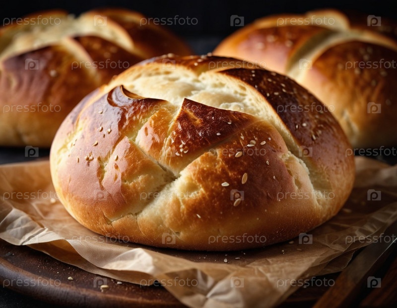 Красиво обработанная круглая буханка хлеба выходит из духовки, ее золотая корка сверкает семенами кунжута. Теплый приглашающий хлеб сидит на деревянной доске, излучая утешительный аромат, который наполняет деревенскую кухню