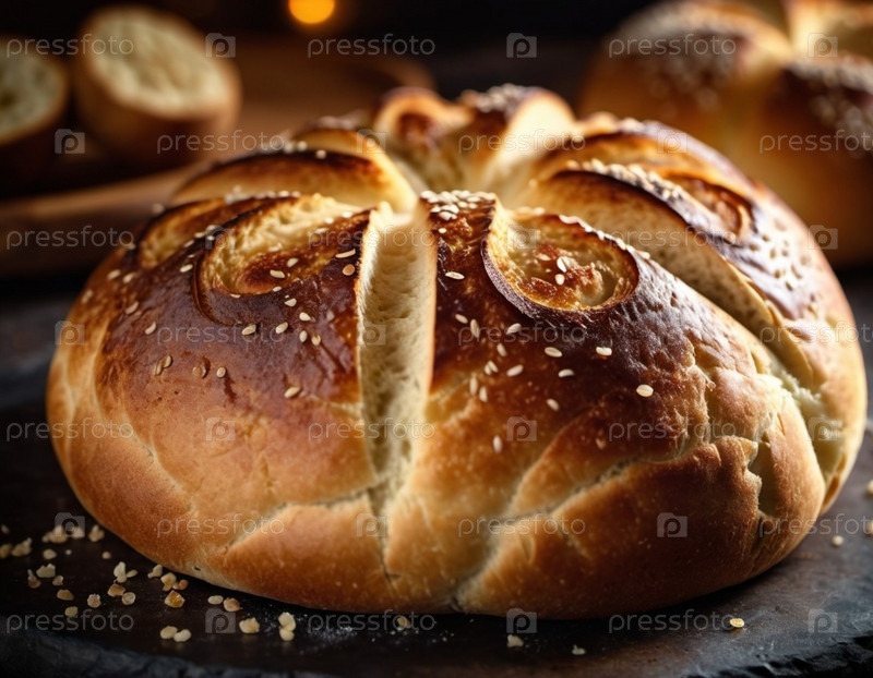 Красиво обработанная круглая буханка хлеба выходит из духовки, ее золотая корка сверкает семенами кунжута. Теплый приглашающий хлеб сидит на деревянной доске, излучая утешительный аромат, который наполняет деревенскую кухню
