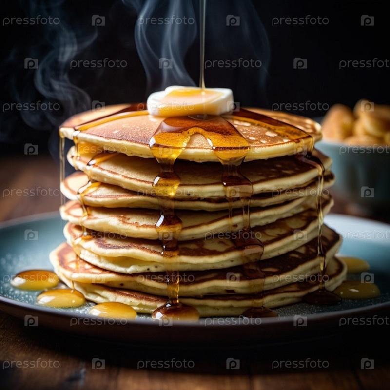 Блинчики уложены высоко и увенчаны щедрым кусочком сливочного масла. Теплый богатый медовый кленовый сироп доносится сверху. Приглашаем аромат. Домашнее чувство завтрака. Кухонная сцена. ИИ