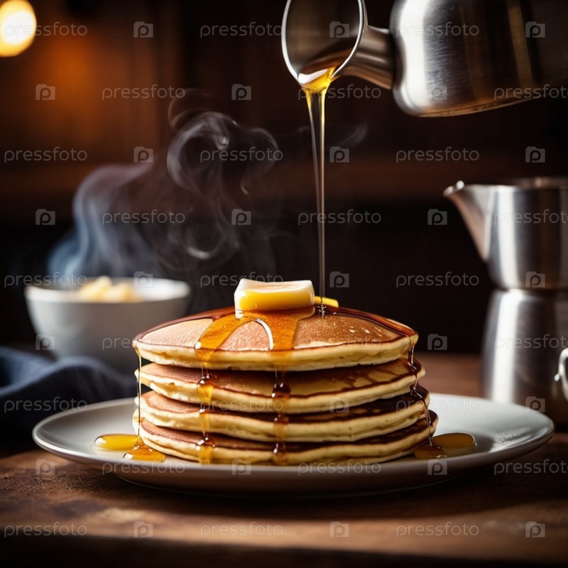Блинчики уложены высоко и увенчаны щедрым кусочком сливочного масла. Теплый богатый медовый кленовый сироп доносится сверху. Приглашаем аромат. Домашнее чувство завтрака. Кухонная сцена. ИИ