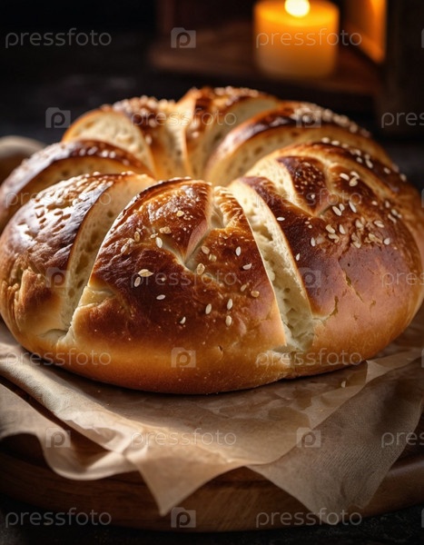 Красиво обработанная круглая буханка хлеба выходит из духовки, ее золотая корка сверкает семенами кунжута. Теплый приглашающий хлеб сидит на деревянной доске, излучая утешительный аромат, который наполняет деревенскую кухню