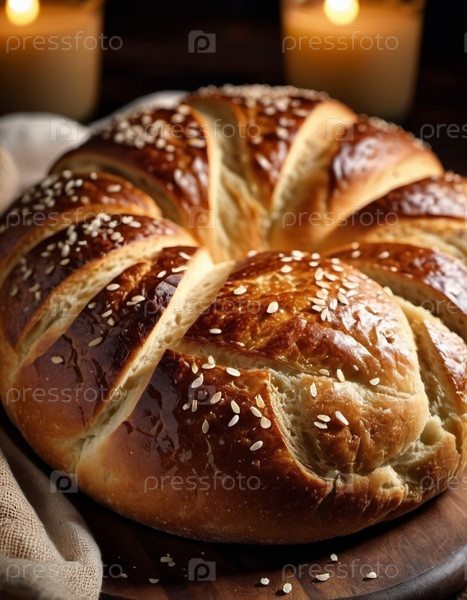 Красиво обработанная круглая буханка хлеба выходит из духовки, ее золотая корка сверкает семенами кунжута. Теплый приглашающий хлеб сидит на деревянной доске, излучая утешительный аромат, который наполняет деревенскую кухню