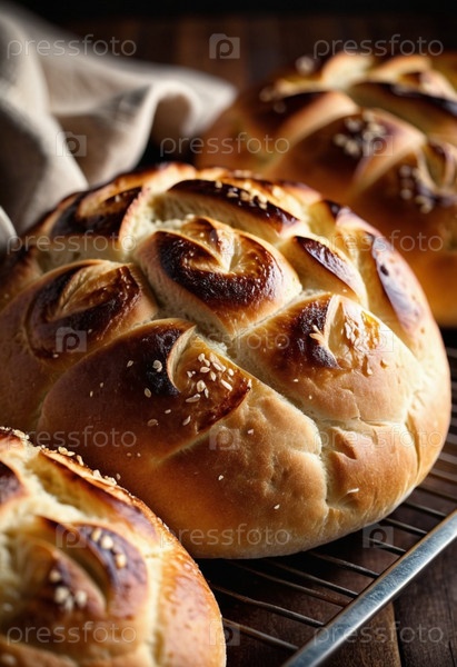 Красиво обработанная круглая буханка хлеба выходит из духовки, ее золотая корка сверкает семенами кунжута. Теплый приглашающий хлеб сидит на деревянной доске, излучая утешительный аромат, который наполняет деревенскую кухню