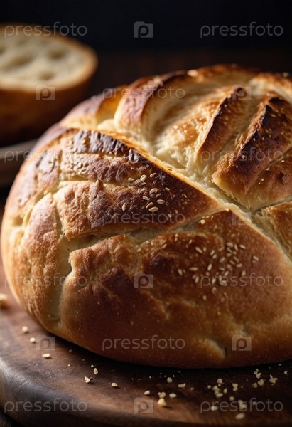 Красиво обработанная круглая буханка хлеба выходит из духовки, ее золотая корка сверкает семенами кунжута. Теплый приглашающий хлеб сидит на деревянной доске, излучая утешительный аромат, который наполняет деревенскую кухню