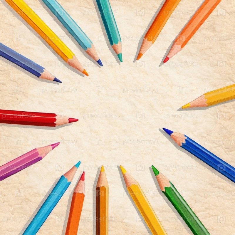 Ассортимент цветных карандашей, в различных оттенках и длинах, устроен круговым образом вокруг чистого листа бумаги. Карандаши, демонстрирующие яркие оттенки, красочные границы, приглашающие к творчеству. ИИ