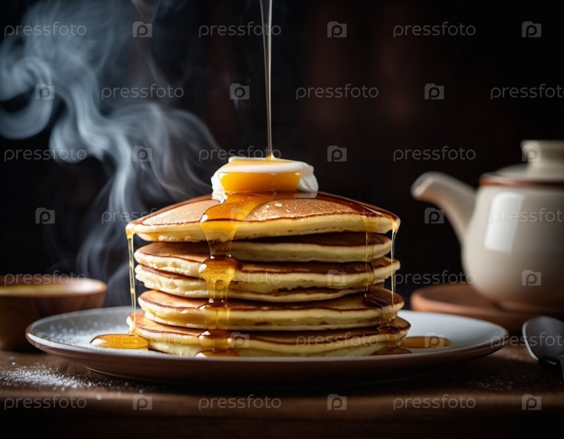 Блинчики уложены высоко и увенчаны щедрым кусочком сливочного масла. Теплый богатый медовый кленовый сироп доносится сверху. Приглашаем аромат. Домашнее чувство завтрака. Кухонная сцена. ИИ