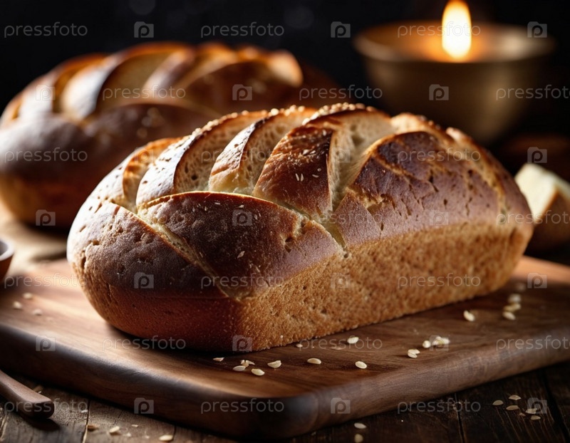 Свежеиспеченный ржаной хлеб сидит на деревянной доске, демонстрируя свою золотисто-коричневую хрустящую корку, украшенную семенами кунжута. Теплая буханка, прямоугольной формы, источает приглашающий аромат, который наполняет уютную кухню. ИИ