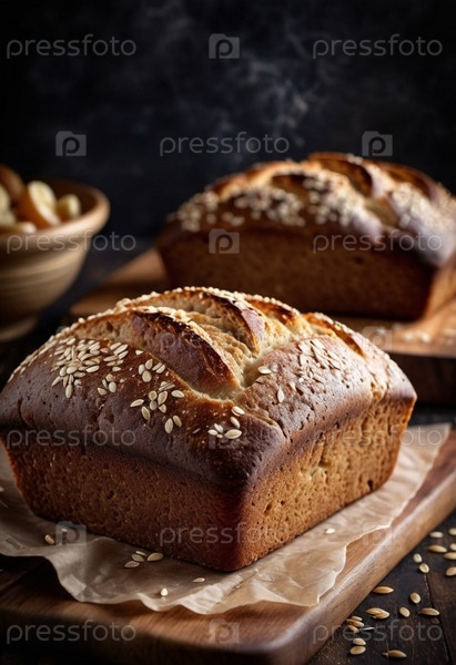 Свежеиспеченный ржаной хлеб сидит на деревянной доске, демонстрируя свою золотисто-коричневую хрустящую корку, украшенную семенами кунжута. Теплая буханка, прямоугольной формы, источает приглашающий аромат, который наполняет уютную кухню. ИИ