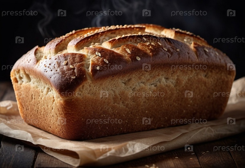 Свежеиспеченный ржаной хлеб сидит на деревянной доске, демонстрируя свою золотисто-коричневую хрустящую корку, украшенную семенами кунжута. Теплая буханка, прямоугольной формы, источает приглашающий аромат, который наполняет уютную кухню. ИИ