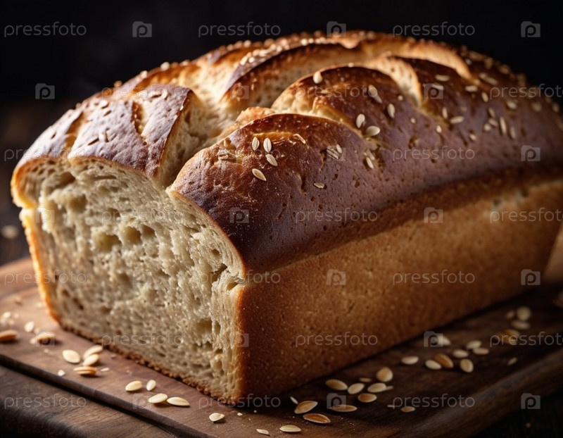 Свежеиспеченный ржаной хлеб сидит на деревянной доске, демонстрируя свою золотисто-коричневую хрустящую корку, украшенную семенами кунжута. Теплая буханка, прямоугольной формы, источает приглашающий аромат, который наполняет уютную кухню. ИИ