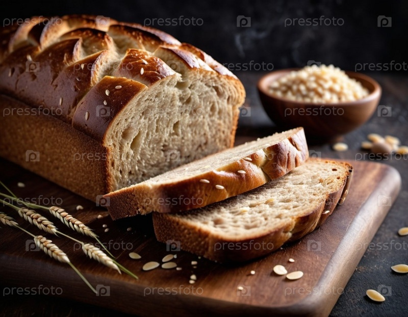 Свежеиспеченный ржаной хлеб сидит на деревянной доске, демонстрируя свою золотисто-коричневую хрустящую корку, украшенную семенами кунжута. Теплая буханка, прямоугольной формы, источает приглашающий аромат, который наполняет уютную кухню. ИИ