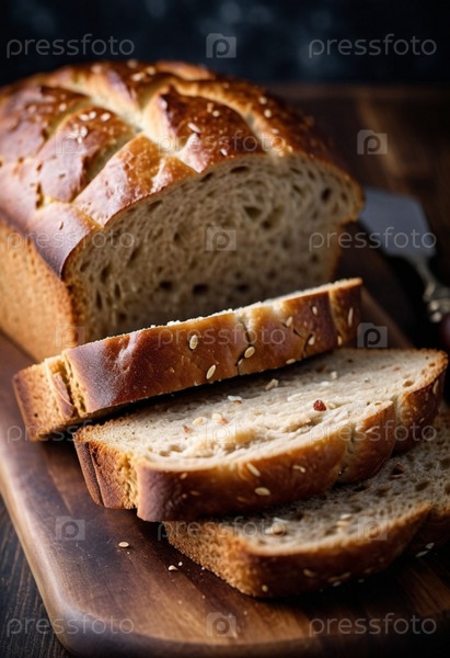 Свежеиспеченный ржаной хлеб сидит на деревянной доске, демонстрируя свою золотисто-коричневую хрустящую корку, украшенную семенами кунжута. Теплая буханка, прямоугольной формы, источает приглашающий аромат, который наполняет уютную кухню. ИИ