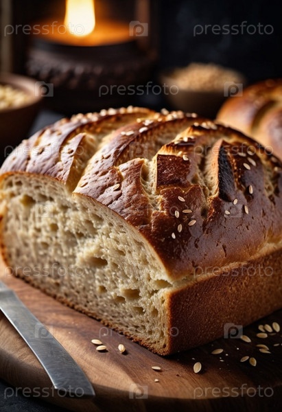 Свежеиспеченный ржаной хлеб сидит на деревянной доске, демонстрируя свою золотисто-коричневую хрустящую корку, украшенную семенами кунжута. Теплая буханка, прямоугольной формы, источает приглашающий аромат, который наполняет уютную кухню. ИИ