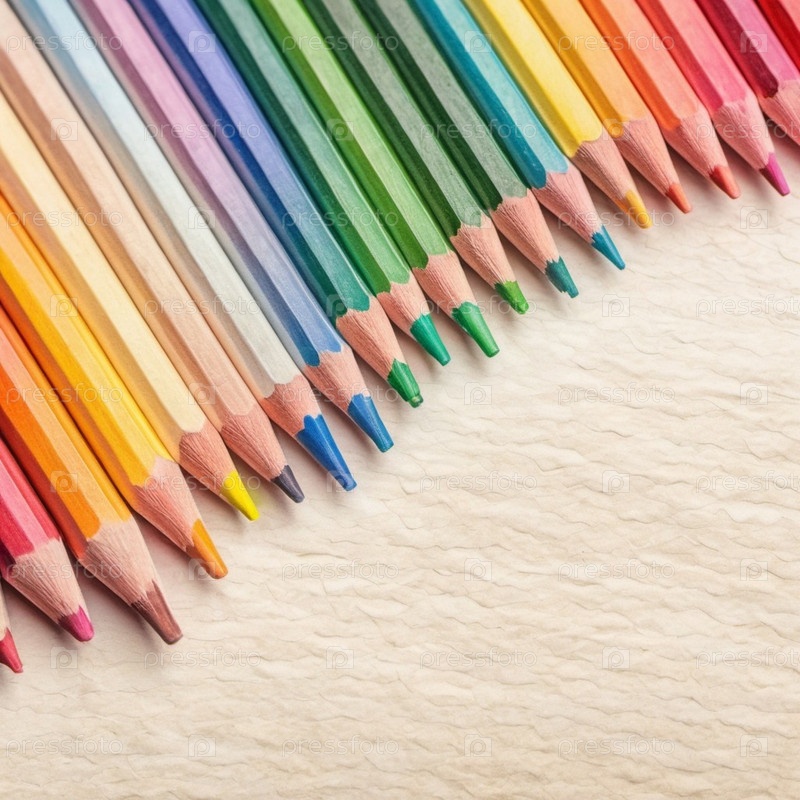 Яркие карандаши и цветные карандаши случайно расположены на бумажной поверхности. Художественная установка предполагает среду, наполненную творчеством, готовую к рисованию или раскраске. Карандаши и карандаши. ИИ