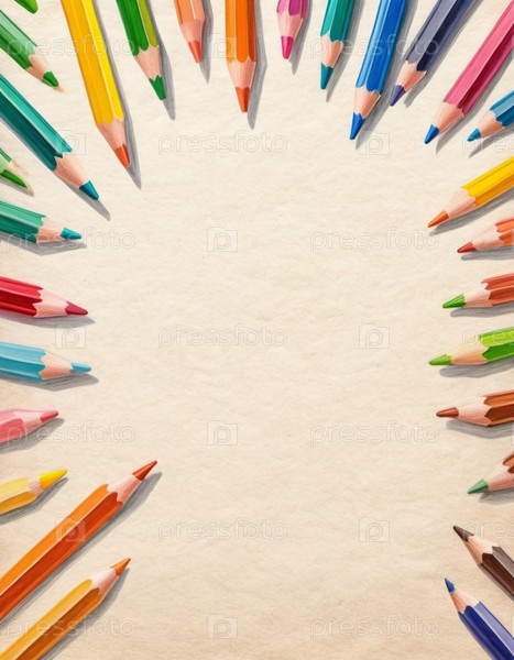 Ассортимент цветных карандашей, в различных оттенках и длинах, устроен круговым образом вокруг чистого листа бумаги. Карандаши, демонстрирующие яркие оттенки, красочные границы, приглашающие к творчеству. ИИ