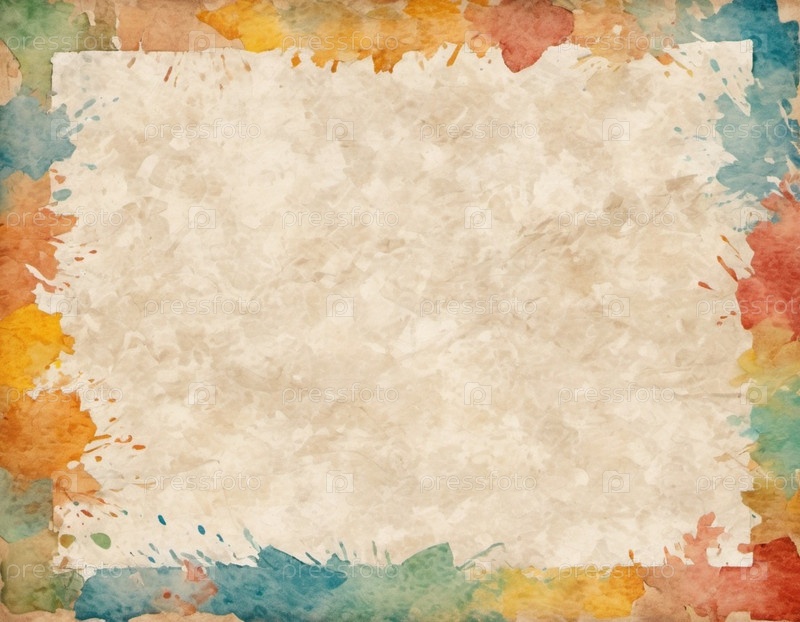 Текстурированный винтажный бумажный фон. Краска плескается в оттенках оранжевого, синего и зеленого. Центральная область остается пустой, демонстрируя персонализированные проекты, сообщения, художественные творения. Акварельный эффект. ИИ