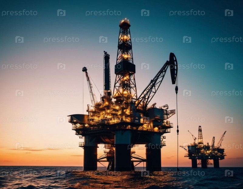Большая, освещенная морская нефтяная вышка стоит высоко в воде в сумерках. Огни буровой установки бросают теплое свечение на темнеющее небо, а силуэт платформы обрамлен рябью воды. ИИ