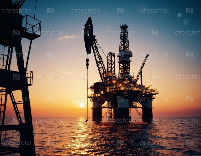 Большая, освещенная морская нефтяная вышка стоит высоко в воде в сумерках. Огни буровой установки бросают теплое свечение на темнеющее небо, а силуэт платформы обрамлен рябью воды. ИИ
