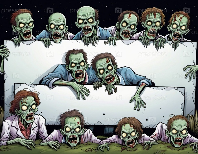 Большая группа зомби, их лица искажены в выражениях голода и упадка, держат пустой знак, их бледная, разлагающаяся кожа и пятна крови видны. Мертвые поднимаются на кладбище ночью. ИИ