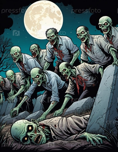 Ужасные комические зомби выходят из могил, разложившиеся тела освещаются лунным светом. Скелетные фигуры бродят среди надгробий, в то время как другие ползают по земле, демонстрируя свой ужасный внешний вид. ИИ
