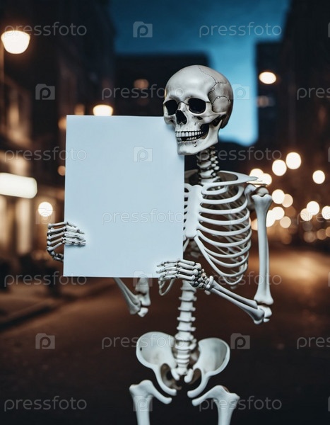 Фигура скелета держит белый плакат. Костящиеся руки скелета предлагают достаточно места для любого сообщения или дизайна. Скелет что-то предлагает. Тема Хэллоуина. генерируемый