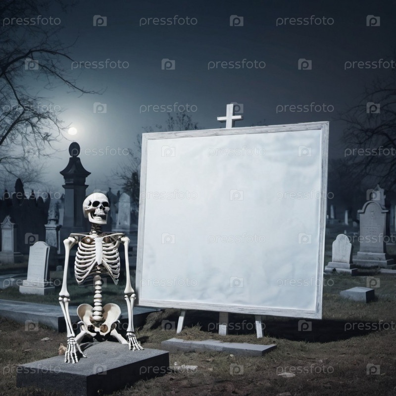 Фигура скелета держит белый плакат. Костящиеся руки скелета предлагают достаточно места для любого сообщения или дизайна. Скелет что-то предлагает. Тема Хэллоуина. генерируемый