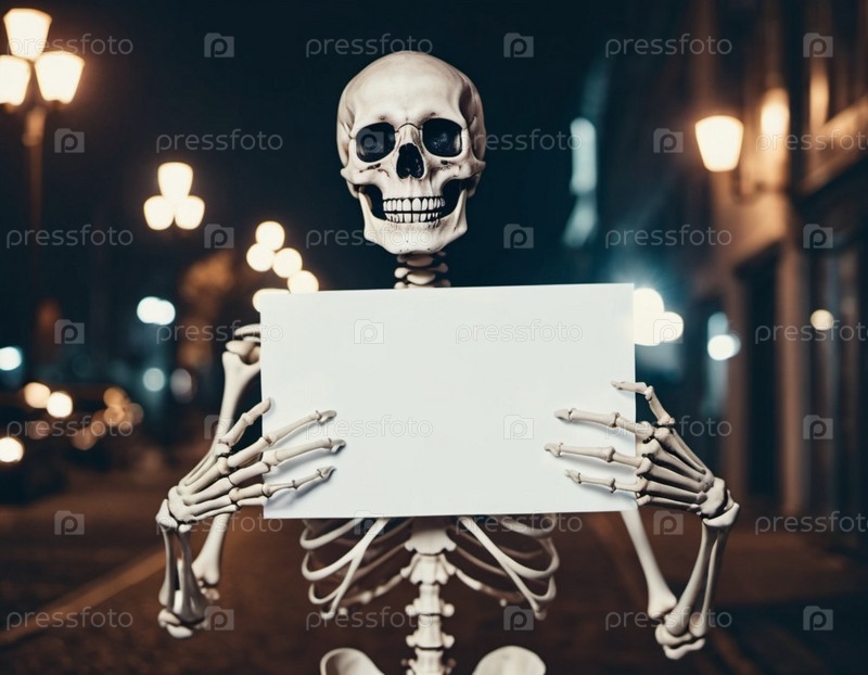 Фигура скелета держит белый плакат. Костящиеся руки скелета предлагают достаточно места для любого сообщения или дизайна. Скелет что-то предлагает. Тема Хэллоуина. генерируемый