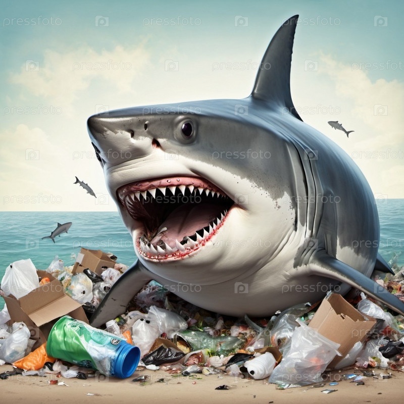 Большая яростная акула прорывается через кучу мусора на пляже, подчеркивая воздействие загрязнения на окружающую среду. Генерирующий ИИ