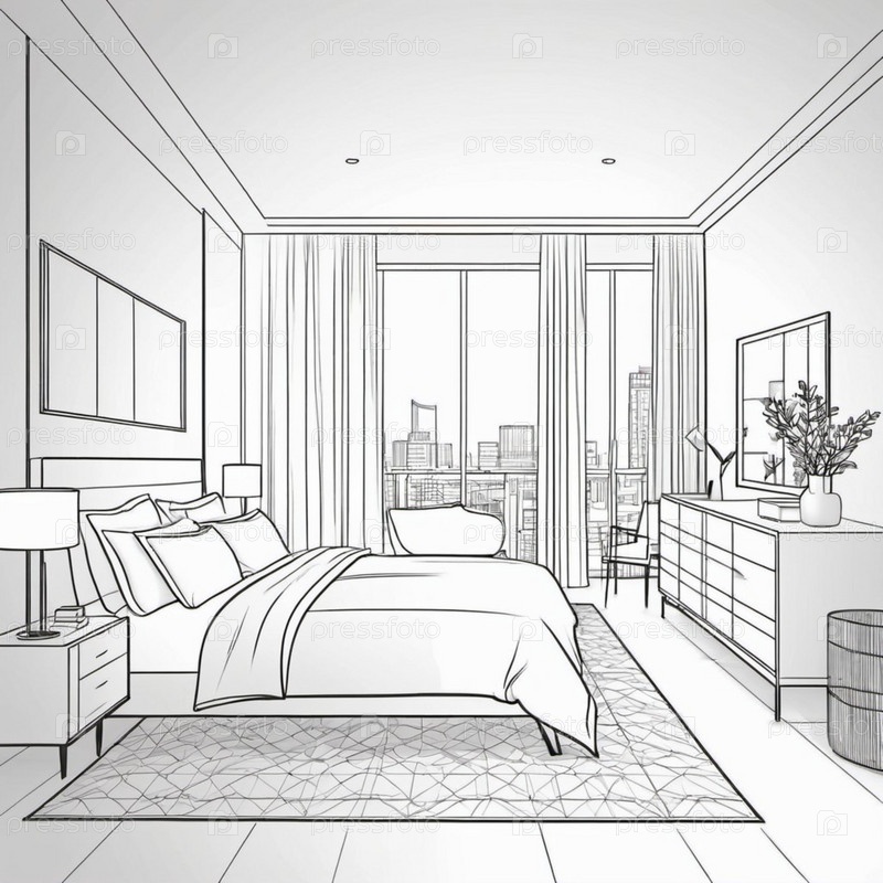 Современная спальня демонстрирует чистые линии, большие окна на фоне городского пейзажа и стильную мебель, создающую безмятежную атмосферу