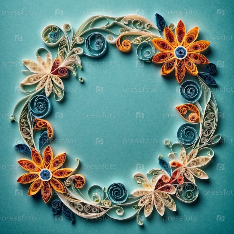 Красочный колючий цветочный венок с замысловатыми рисунками на фоне тила, демонстрирующими художественное мастерство. Каждый цветочный и природный мотив подчеркивает мастерство в бумажном искусстве. Генерирующий ИИ