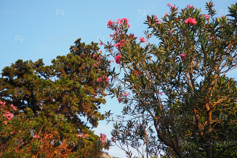 Нериевый олеандр, розовый залив, выращиваемый во всем мире в умеренных и субтропических районах в качестве декоративного и ландшафтного растения. Genus Nerium, Apocynoideae, Apocynaceae. Черногория, Адриатика, Средиземноморье