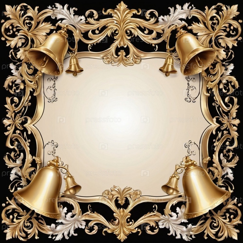Декоративная золотая рама с старинными колоколами и замысловатыми цветочными узорами, идеально подходящая для элегантных объявлений и приглашений. Генеративный ИИ. Сочетание металлических оттенков и витиеватых деталей