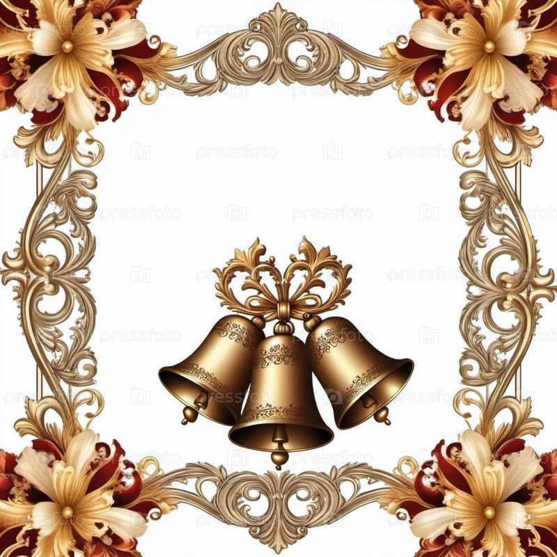 Декоративная цветочная рама с элегантными золотыми колоколами, расположенными в центре на белом фоне в художественной планировке. Генеративный ИИ. Праздничные элементы для различных торжеств или декоративных целей