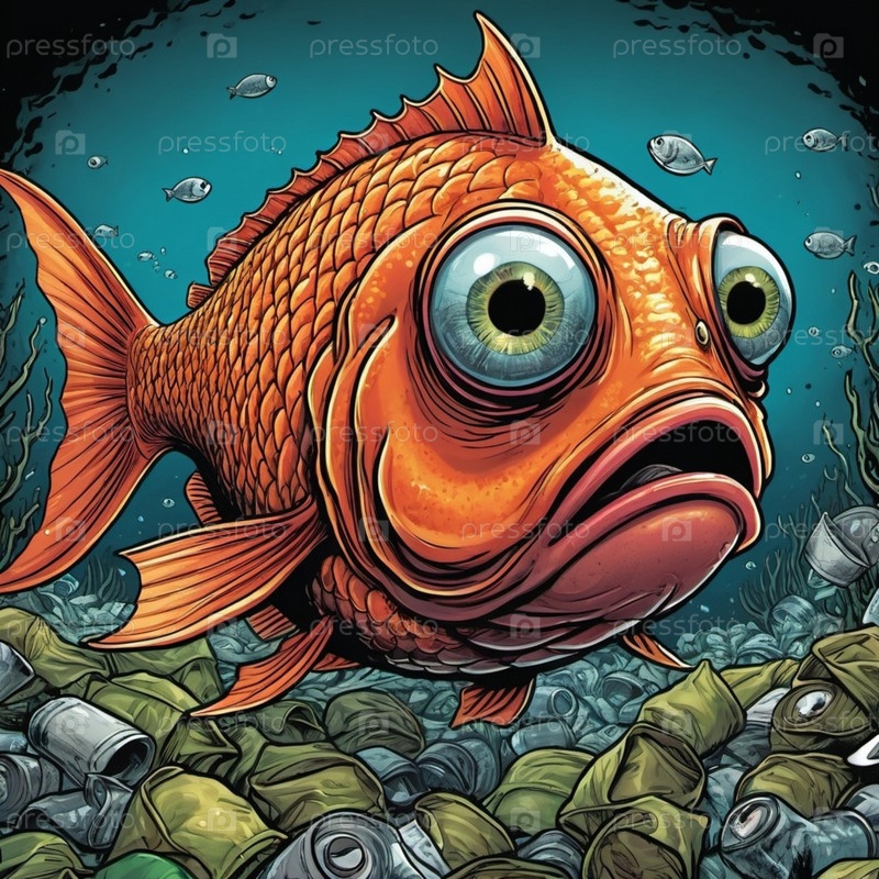 Большая рыба с преувеличенными выпуклыми глазами реагирует в ужасе, когда она плавает через загрязненную область, заполненную выброшенным мусором, демонстрируя последствия загрязнения воды. Рыба с открытым ртом. Искусство