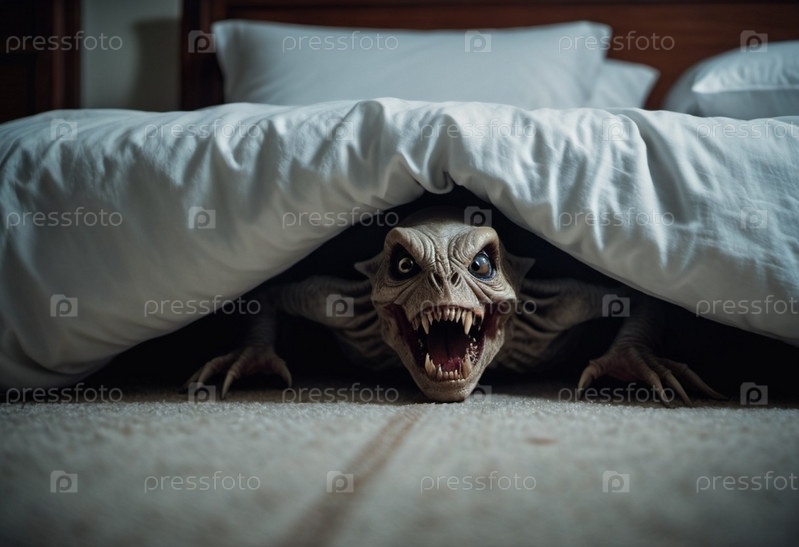 Ужасающее кошмарное существо, скрывающееся под кроватью в тускло освещенной спальне, захватывает сущность страха и неизвестности ночью. Гротескное существо с привидениями тихо появляется из-под кровати. ИИ