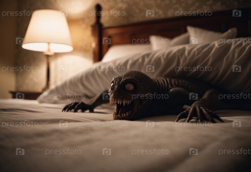 Ужасающее кошмарное существо, скрывающееся под кроватью в тускло освещенной спальне, захватывает сущность страха и неизвестности ночью. Гротескное существо с привидениями тихо появляется из-под кровати. ИИ